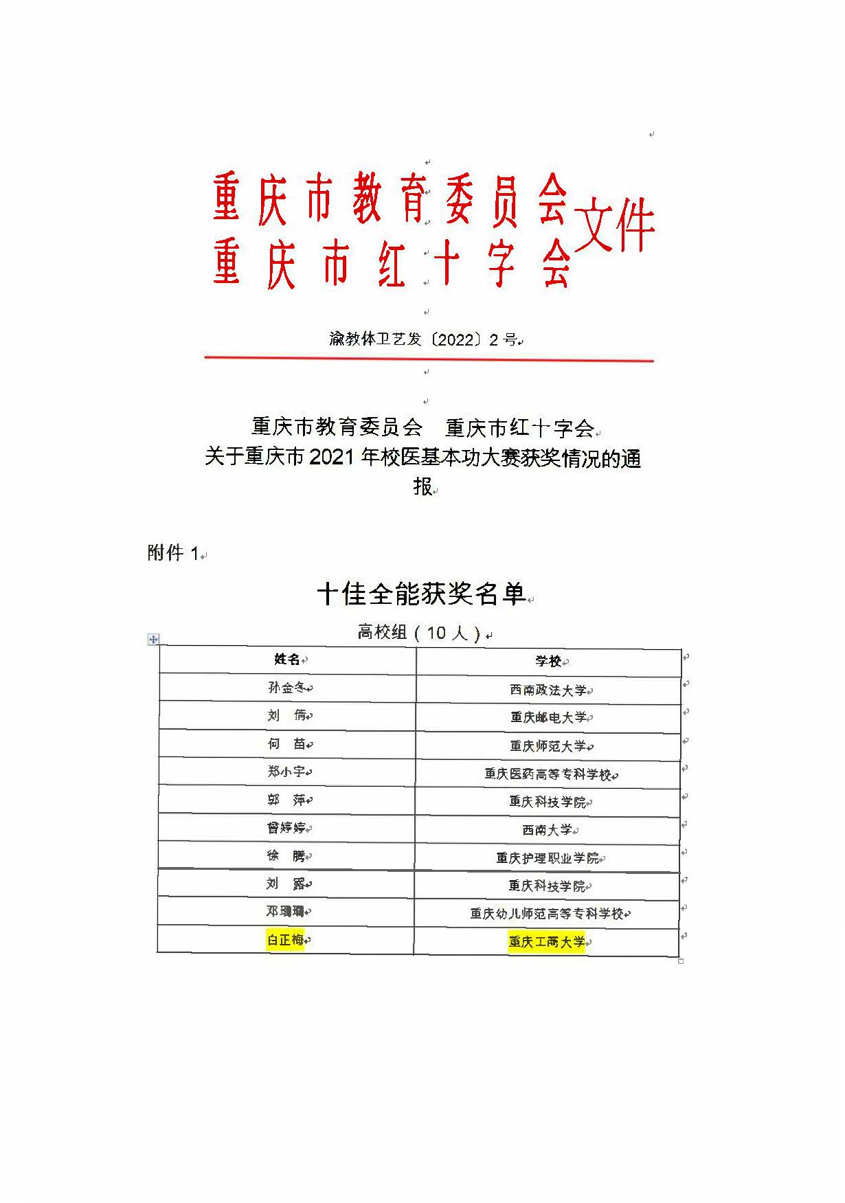 由重庆市教育委员会、重庆市红十字会主办,西南大学、重庆市中小学卫生保健所承办的重庆市校医基本功大赛于2021年12月12-14日在西南大学举行,威尼斯官网校医院精心组织、积极备战,经过与全市其他高校医院激烈角逐,最终威尼斯官网校医院勇夺佳绩,取得二等奖3个、三等奖2个,白正梅同志获得十佳校医荣誉称号,学校获得优秀组织奖,校医院负责人获得优秀组织者奖。