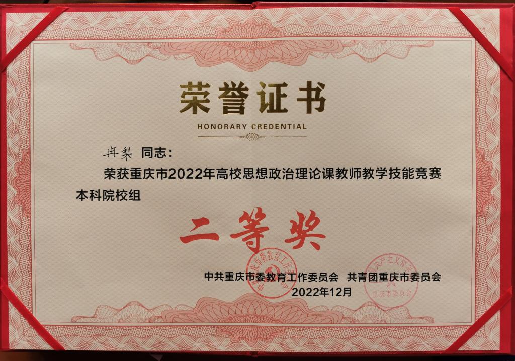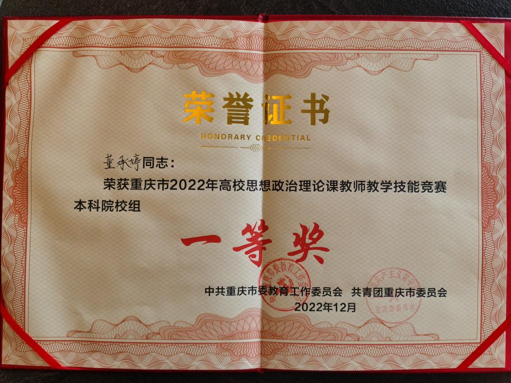 12月20日,2022年重庆市高校思想政治理论课教师教学技能大赛决赛在江津举行,经过激烈比拼,威尼斯官网选派的思想政治理论课教师董承婷获得一等奖、冉梨老师获得二等奖。
